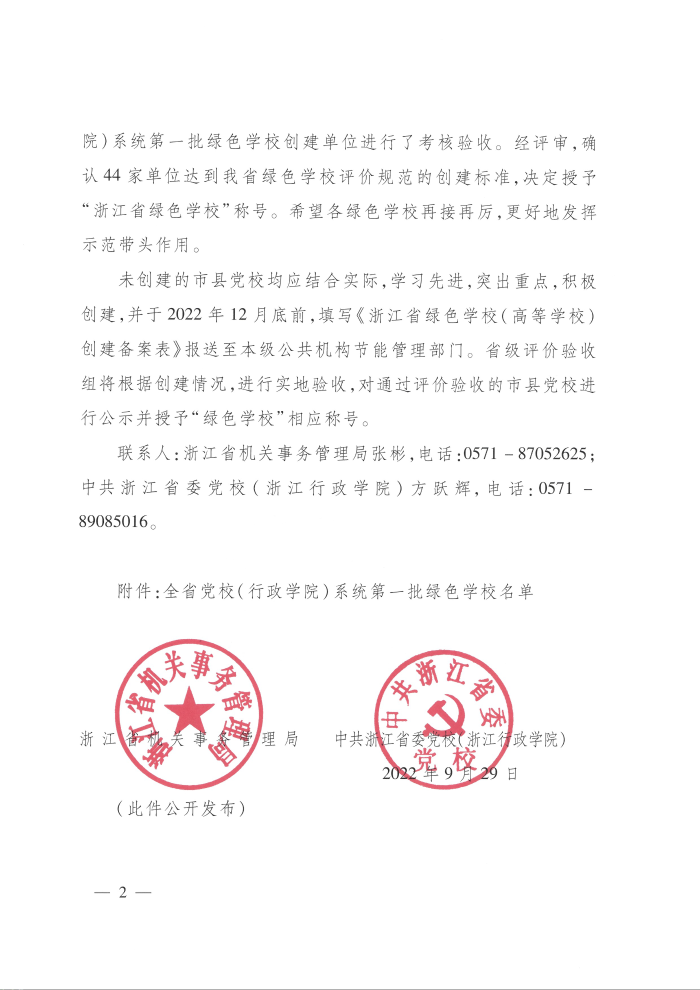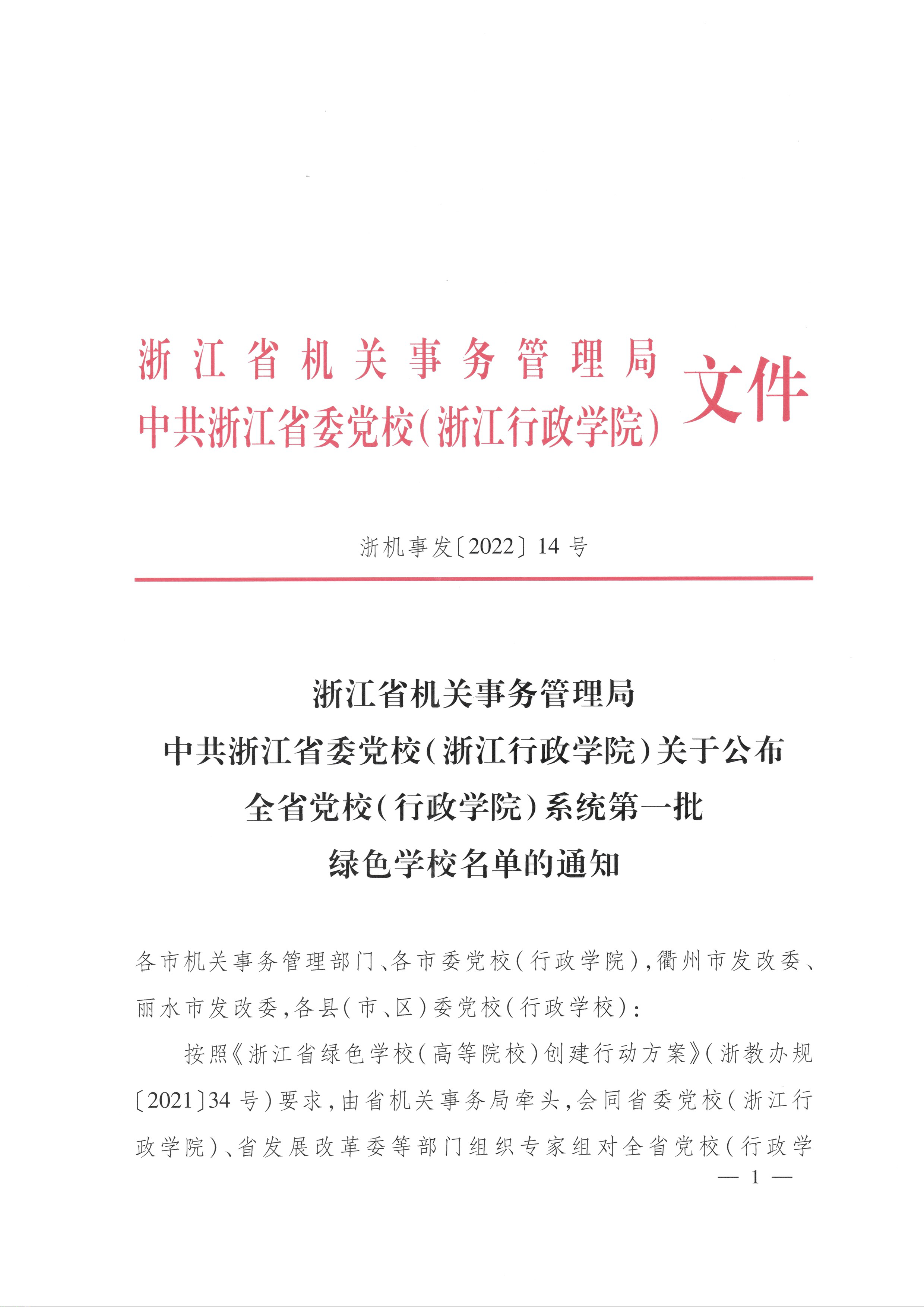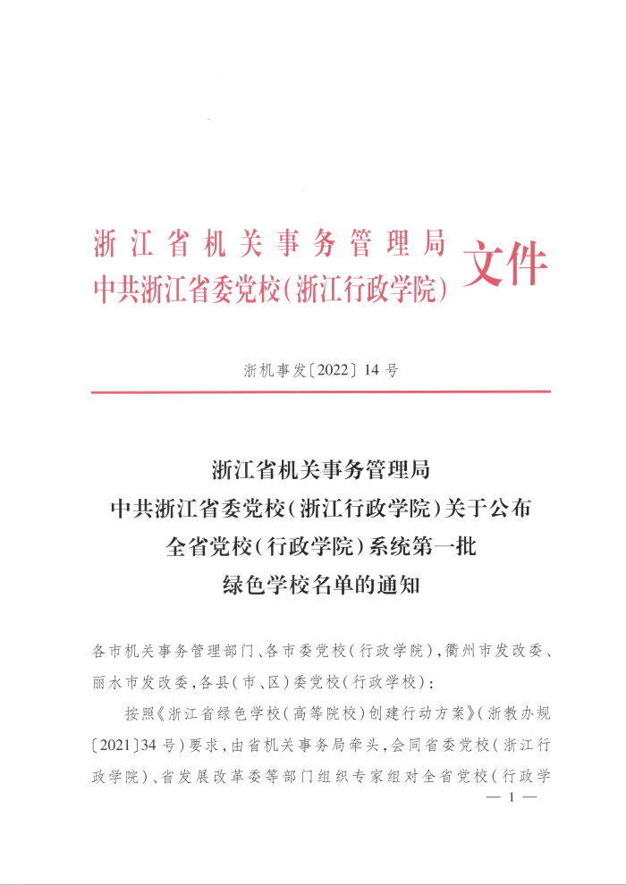 近日,浙江省机关事务管理局、中共浙江省委党校(浙江行政学院)联合发文,公布全省党校(行政学院)系统第一批浙江省绿色学校名单,约彩365app下载_365体育网址_网彩365平台下载获评“三星级绿色学校”称号。