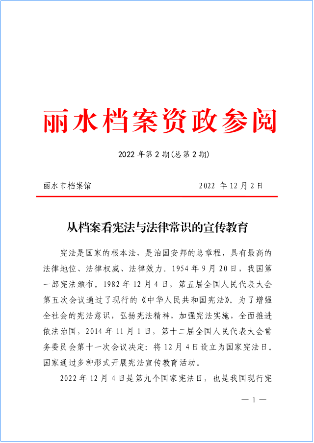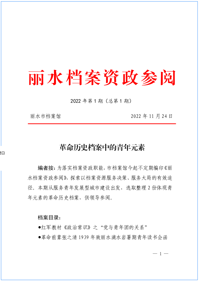 2022年11月24日和30日,市档案馆分别编写主题为《革命历史档案中的青年元素》《从档案看宪法与法律常识的宣传教育》共两期资政参阅,实现档案资政“零突破”。