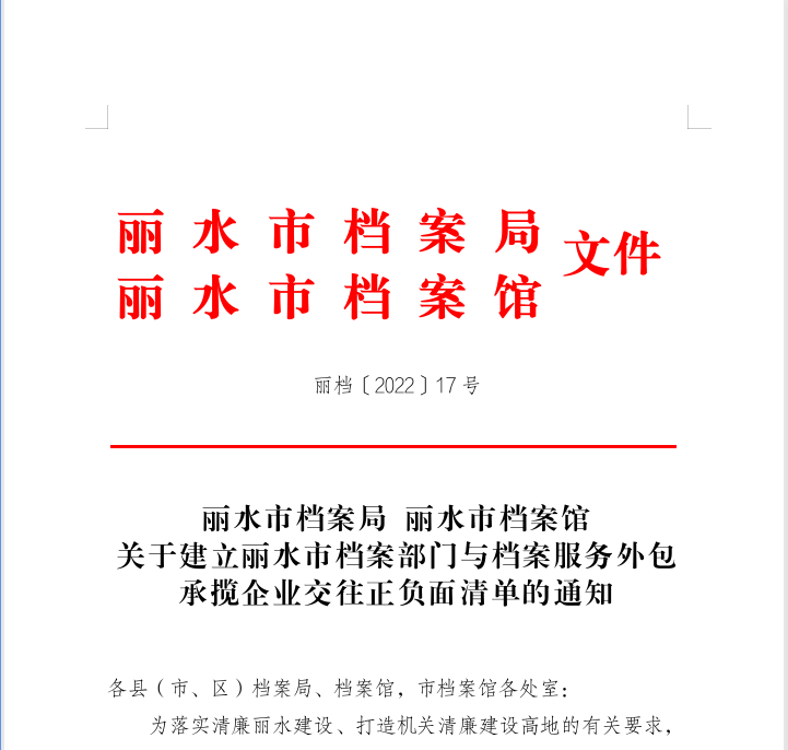 制订出台丽水市档案部门与档案服务外包承揽企业交往正负面清单。“清单十条”清晰彰明政企交往规范,明确廉政风险点和行为界限,充分落实对照反省警示作用,奋力打造机关清廉建设高地。