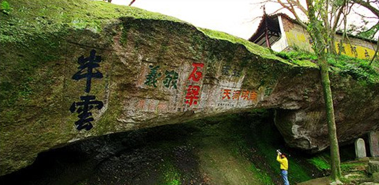 处,主要分列于石梁、高阳洞和云阁崖3处。石梁长达十数丈,凌空横悬,喻为“半云”、“悬虹”,刻有题记20处;高阳洞有摩崖石刻15处,多为宋人遗迹。云阁崖有石刻12处,其中“灵崇”二字,书法遒劲,相传为东晋葛洪所书,有北宋大书画家米芾题写的“南明山”三字。