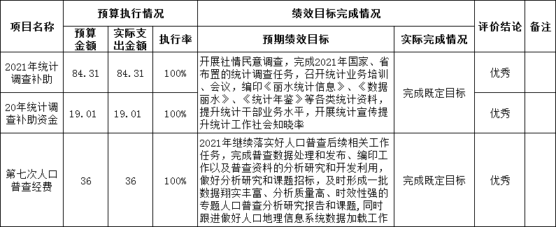 丽水市统计局在2021年度部门决算中反映“2021年统计调查补助”“20年统计调查补助资金”及“第七次人口普查经费”项目绩效自评结果。