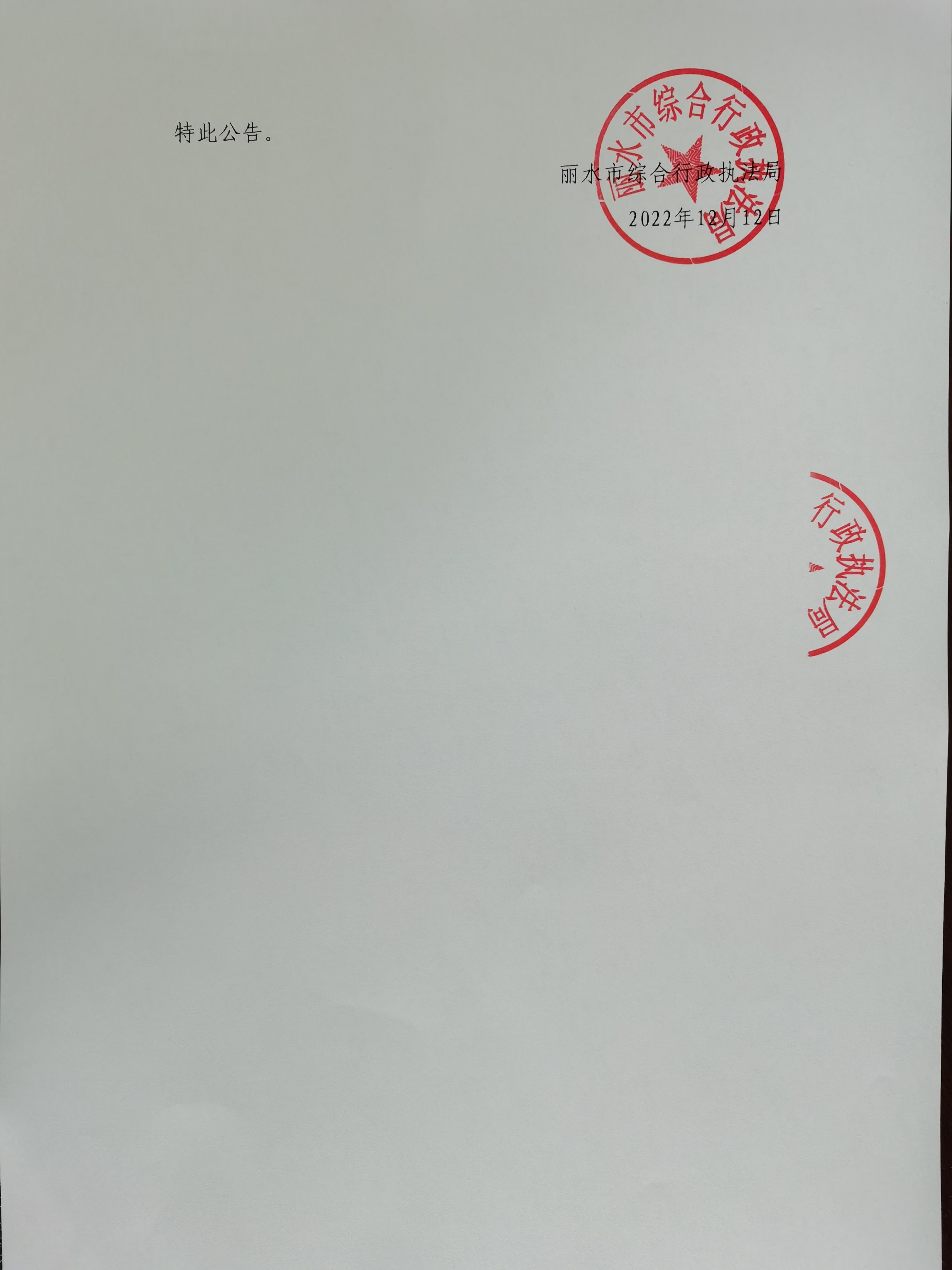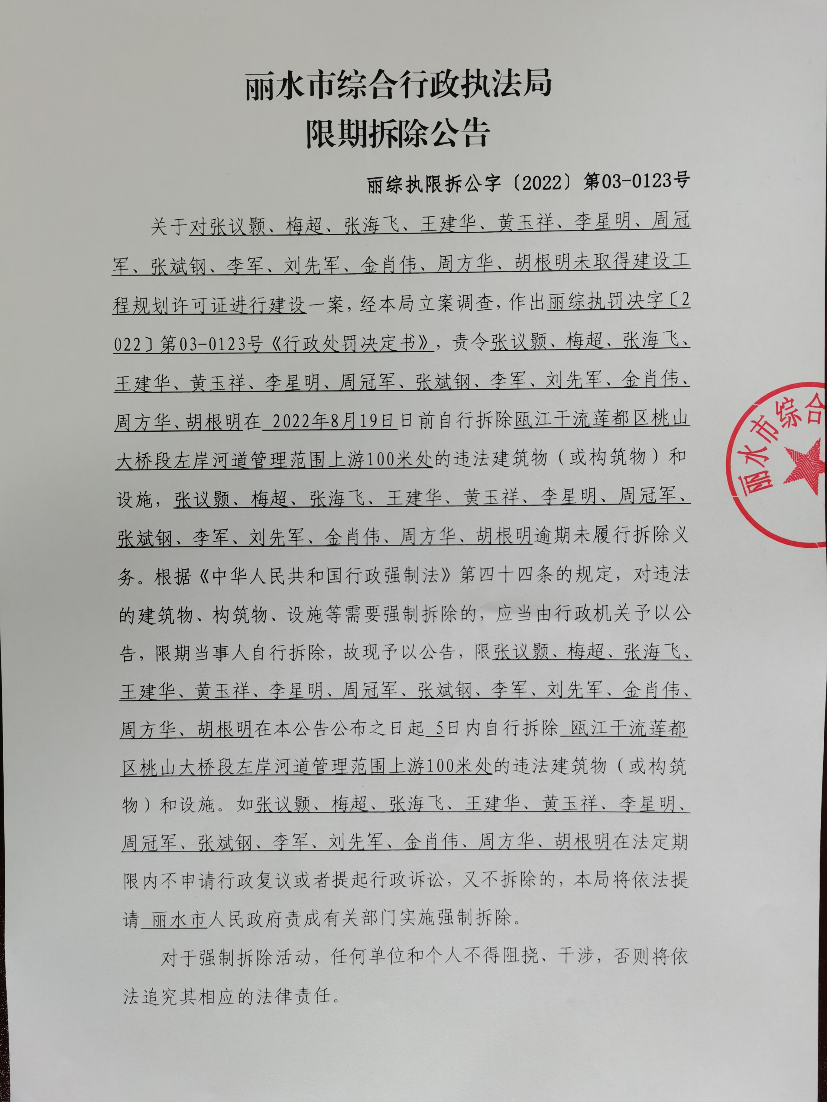 限期拆除公告(丽综执限拆公字〔2022〕第03-0123号)