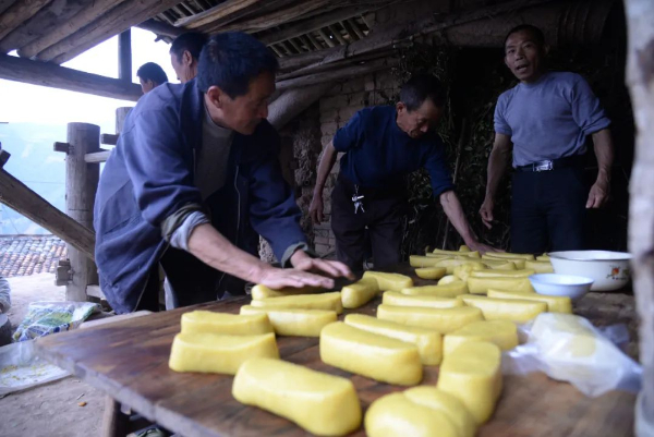 遂昌黄米粿,米用黄金树的植物碱融水浸泡,蒸熟后再通过手工打、揉、搓,一条条金黄色的黄米粿就诞生了。它最适合切薄片和白菜叶炒着吃,口感柔滑、糯Q,让人回味无穷!